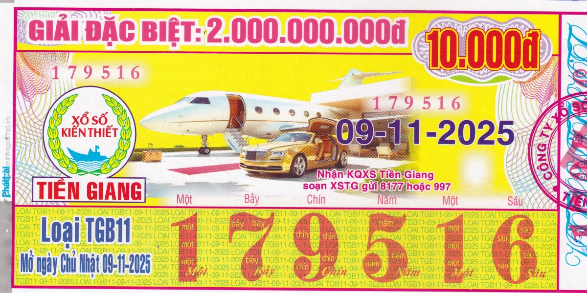 Mẫu vé kiểm tra khi đổi số trúng Tiền Giang Ngày: 09/11/2025